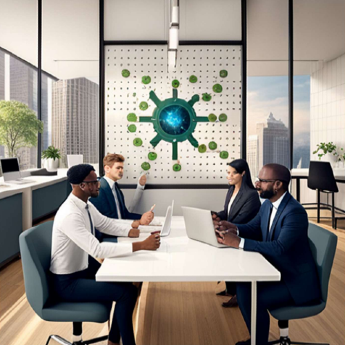 This image has been generated from Stability.ai Dream Studio using the prompt ‘An image depicting the transformative power of AI in an organisational setting. The AI technology is seamlessly integrated into the workplace, driving innovation, efficiency, and collaboration’.